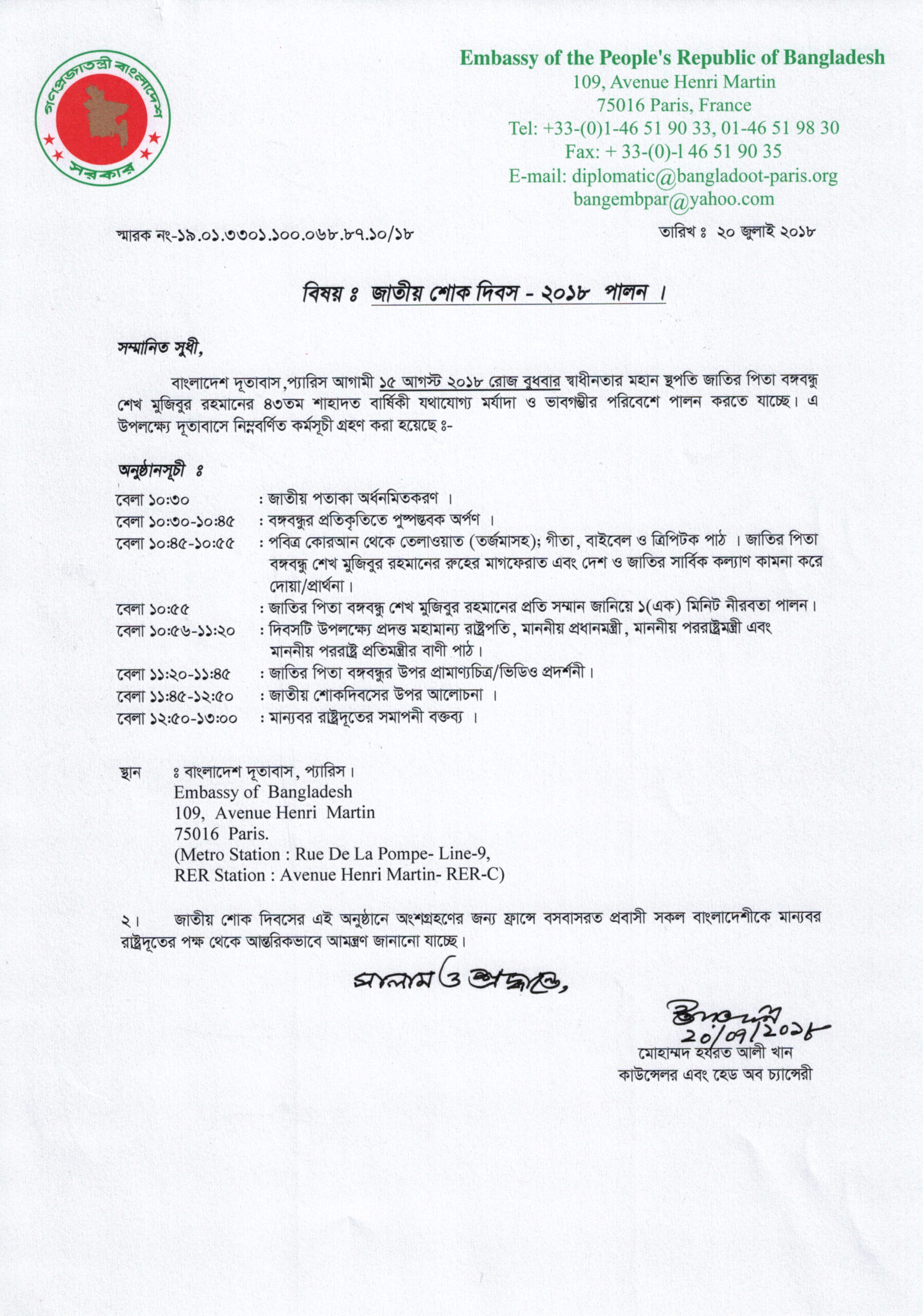 বিজ্ঞপ্তি ঃ আগামী ১৫ আগস্ট ২০১৮ রোজ বুধবার, বেলা ১০ঃ৩০ ঘটিকায় বাংলাদেশ দূতাবাস,ফ্রান্স স্বাধীনতার মহান স্থপতি জাতির পিতা বঙ্গবন্ধু শেখ