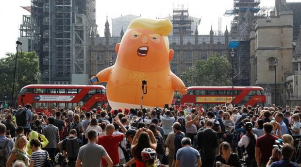 মার্কিন প্রেসিডেন্ট ডোনাল্ড ট্রাম্পের যুক্তরাজ্য সফরের প্রতিবাদে লন্ডনে পার্লামেন্ট ভবনের সামনে জড়ো হয়েছিলেন কয়েক হাজার মানুষ। তারা কমলা রঙের একটি